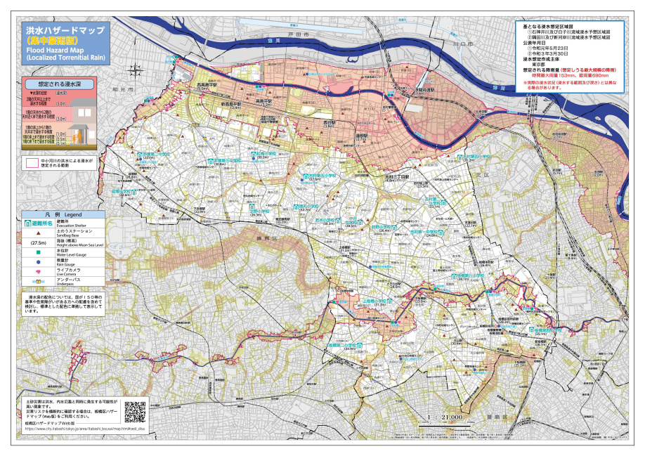 板橋区ハザードマップ(荒川氾濫版)は、平成28年5月30日に国土交通省が公表した「洪水浸水想定区域図」(水防法の規定による想定最大規模降雨、荒川が流れる地域で3日間での総雨量632ミリメートルの降雨があった場合)に基づき作成しています。(令和5年12月改訂)