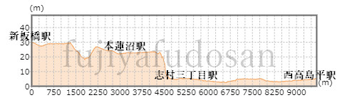 「志村坂上」駅の標高は約23mですが、「志村三丁目」駅の標高は約5mとおよそ18mの高低差になります。