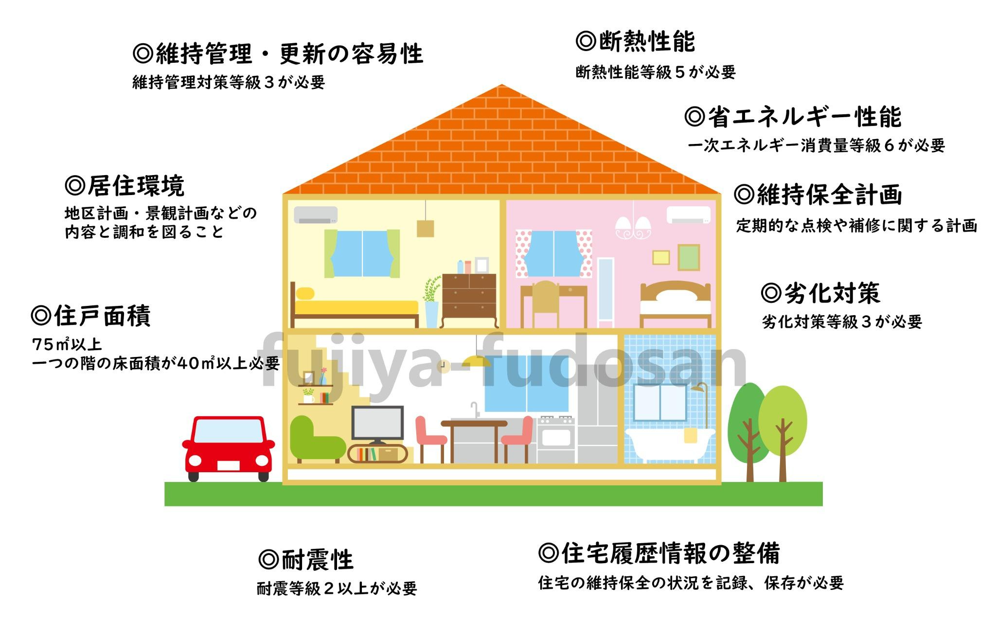 その他、一戸建てへの適用はありませんが、バリアフリー性、可変性などの要件もあります。
