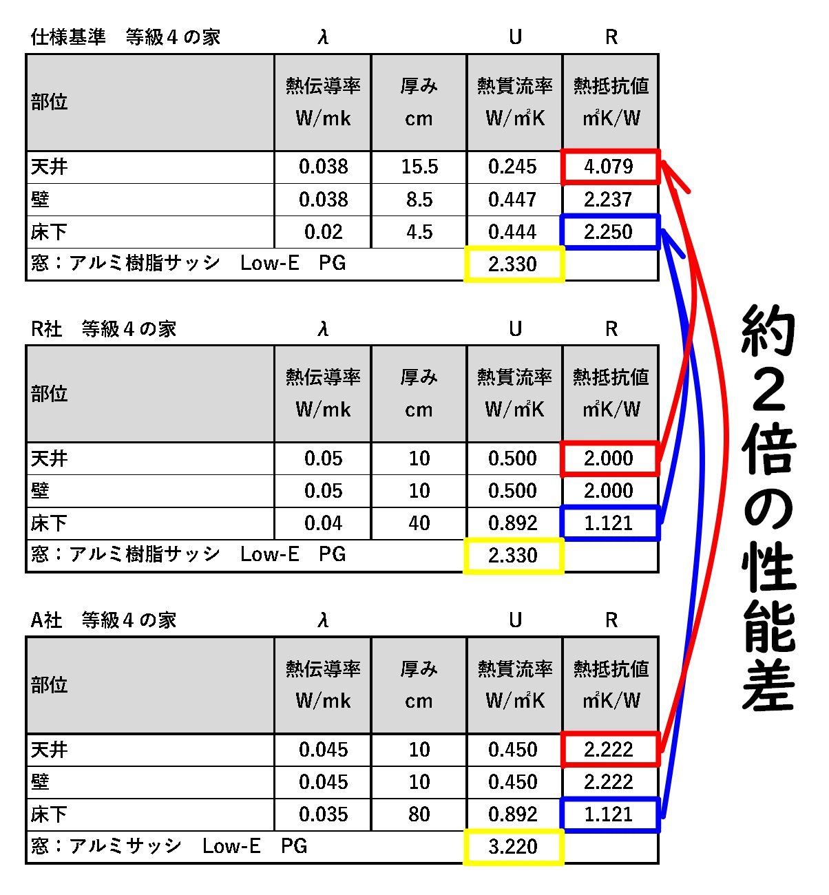 ご覧のように仕様基準と標準計算ルートを採用したR社、A社とでは、天井と床下(1階)部分の断熱の性能差がおよそ2倍も差があることが分かります。