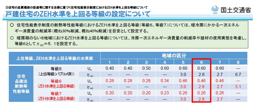 等級5はZEH(ネットゼロエネルギー)基準であるUa値0.6W/㎡K、等級6はHEAT20 G2の0.46W/㎡K、等級7はHEAT20 G3の0.26W/㎡Kという案です。