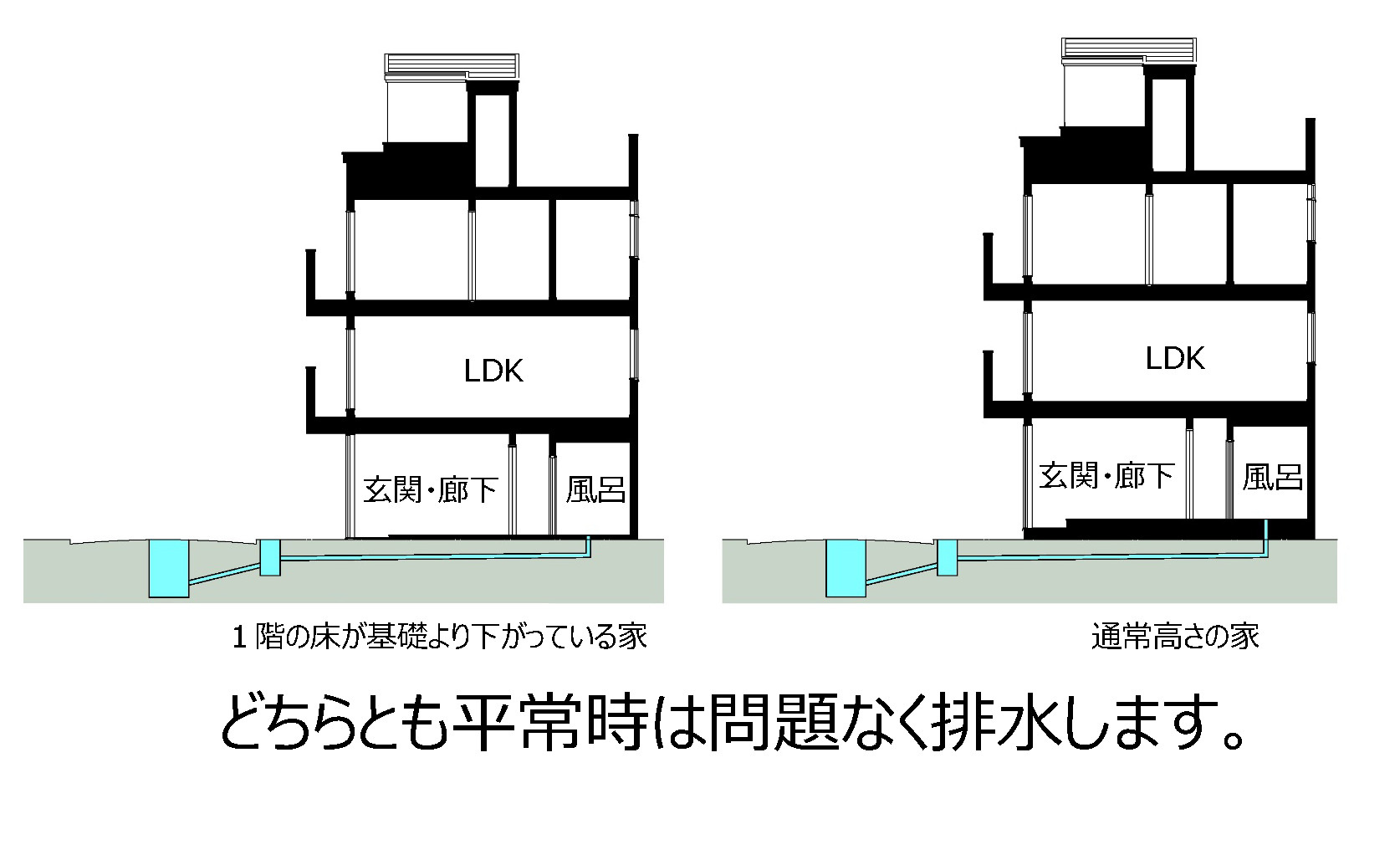 上の写真にある物件は、下水道管を基礎横に通して地中に通しますので、将来的なメンテナンスや付け替えも可能です。