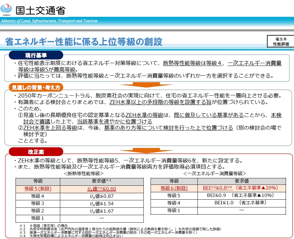 住宅性能表示制度における省エネ対策等級について、令和4年4月1日から断熱等性能等級5、一次エネルギー消費量等級6が創設されました。東京などの6地域の場合、断熱等級5の要求Ua値は0.6W/㎡K以下、一次消費エネルギー対策等級6の要求値はBEI≦0.8と省エネ基準の▲20%というものになります。