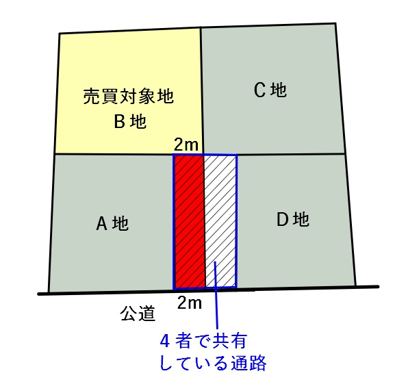 売買対象地はA~Dの4者が所有する通路(建築基準法の道路ではない)を介して公道へ接していたのですが、物件の建築確認では、4者で所有する通路の一部(赤い部分)を売買対象地Bの敷地として申請していることが分かりました。