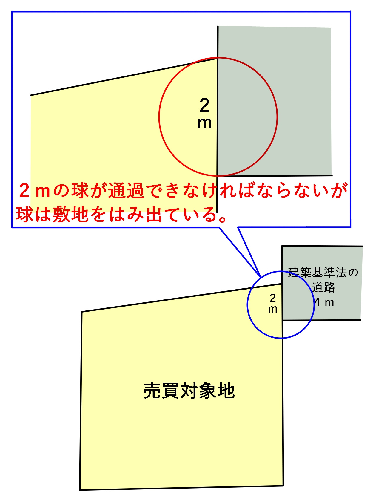 上記の敷地は、敷地上側が道路と並行ではなく鋭角に折れた形状になっているため、2mの球が通ることが出来ません。