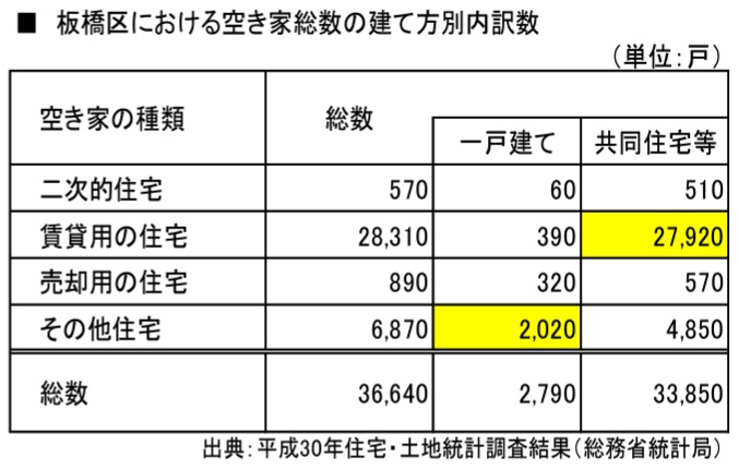 空き家36,640 戸のうち、「その他住宅」とされる一戸建ての空き家は2,020戸(約5%)であり、賃貸用の空き家、つまり「空室」は27,920戸(約76%)に達しています。これから、板橋区での空き家の大部分が賃貸用の空室であることがわかります。