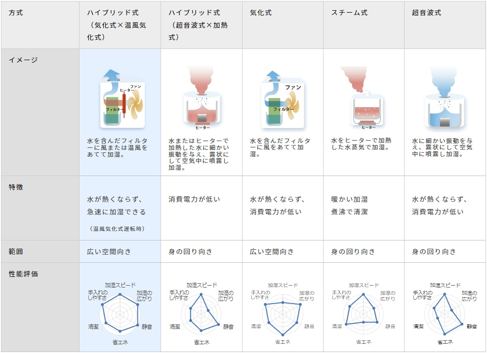 衛生面でスチーム式と迷いましたが、省エネ性や加湿の広がりを考慮して気化式×温風気化式を選びました。
