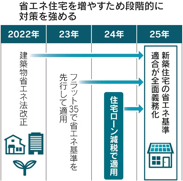 2025年からは、全ての新築建物において省エネ基準を満たさなければならなくなりますが、いきなり新制度に移行するのではなく、不動産会社や工務店などが段階的に対応・移行できるよう、2023年度からフラット35適合において省エネ基準が必須、2024年から住宅ローン減税を利用する際には省エネ基準が必須、2025年度から全面義務化という流れになっています。