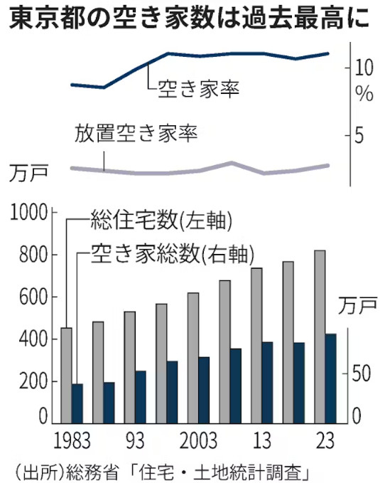 このうち、賃貸、売却用および二次的住宅(別荘など)を除いた戸数は18万戸から21.5万戸に増加し、空き家率は2.6%となっています。これは全国平均の5.9%と比較すると低いものの、東京都内においても放置された空き家が増加傾向にあります。